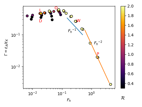 Horizontal Froude number $F_h$ and buoyancy Reynolds number $\R = Re {F_h}^2$