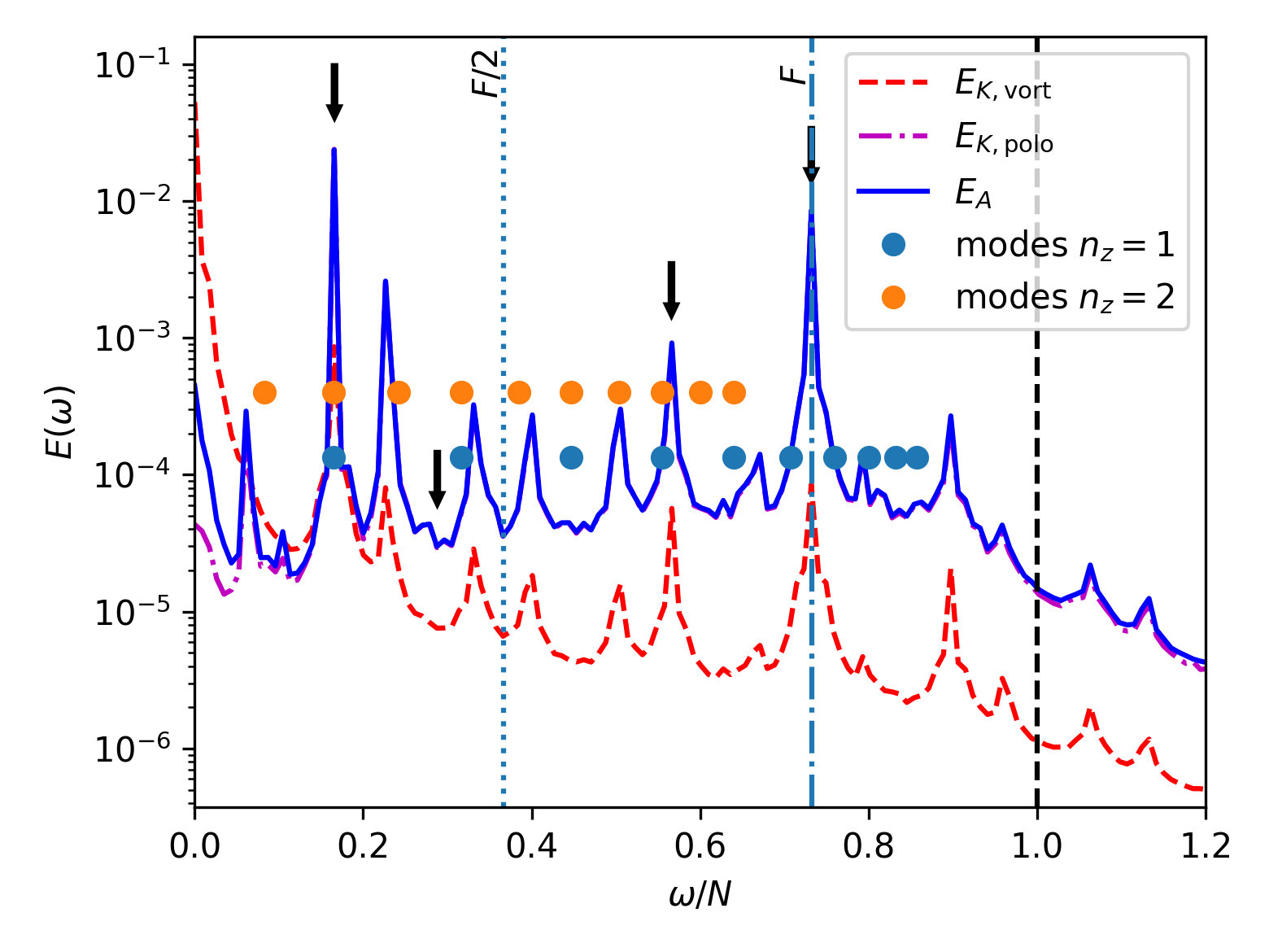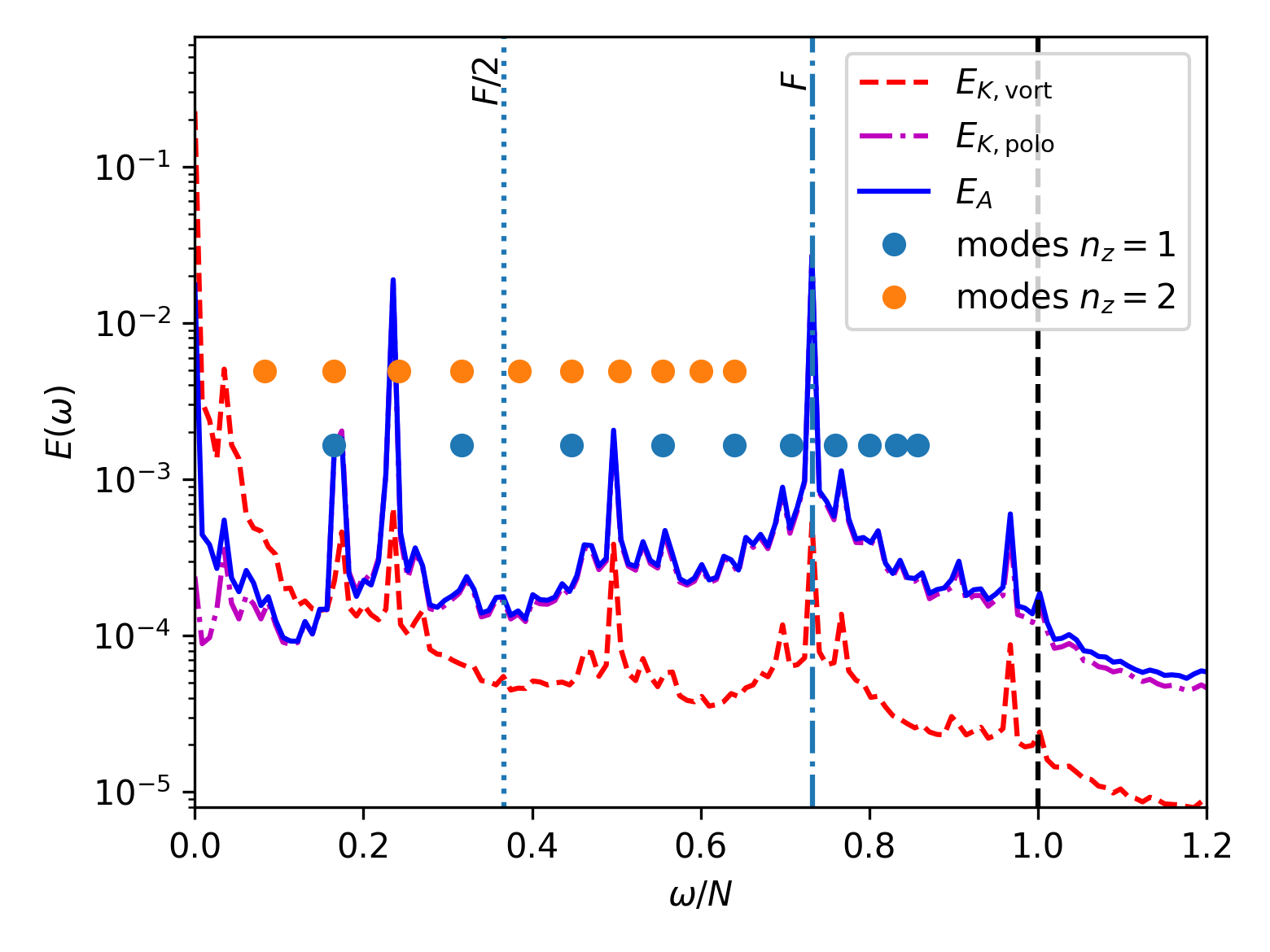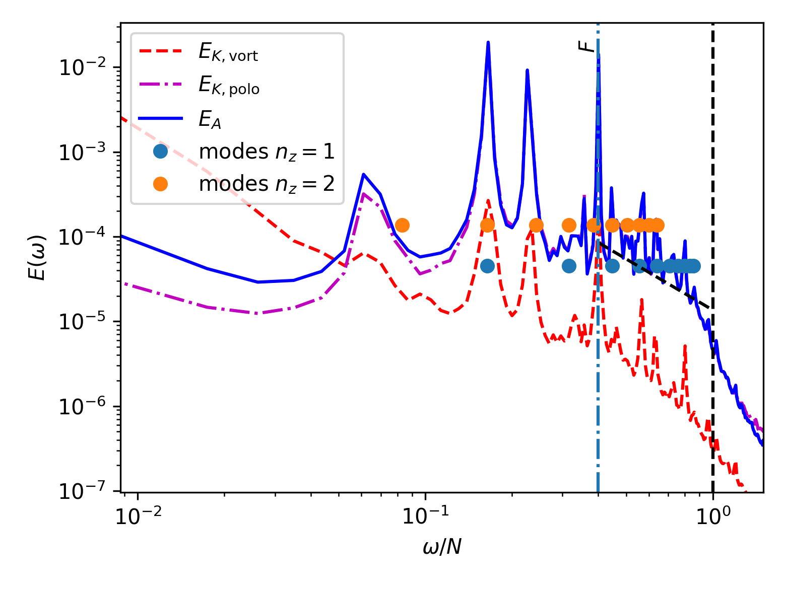 Stable density stratification $\Rightarrow$ Waves (IGW) and "vortices" ($\omega_z$)