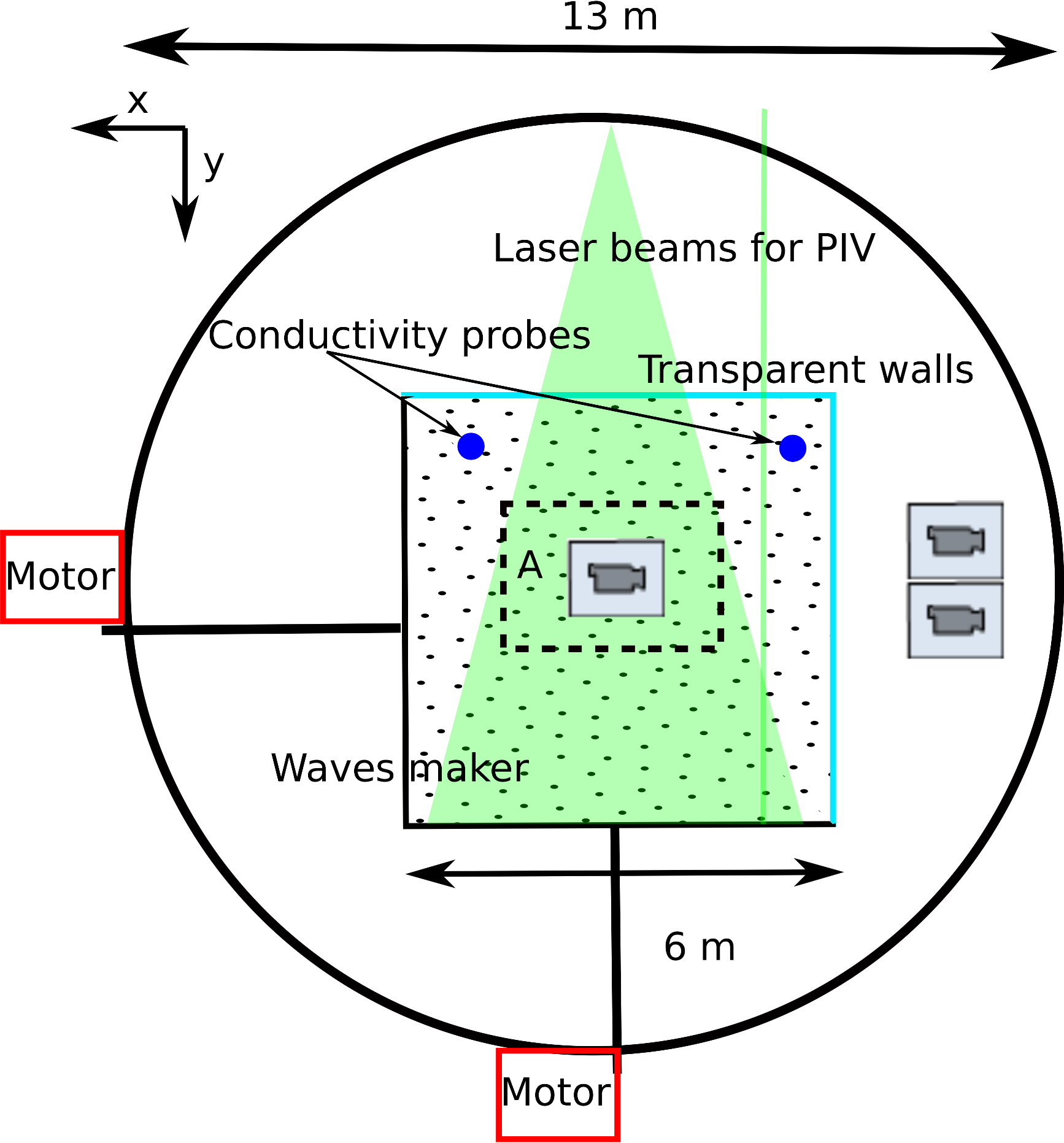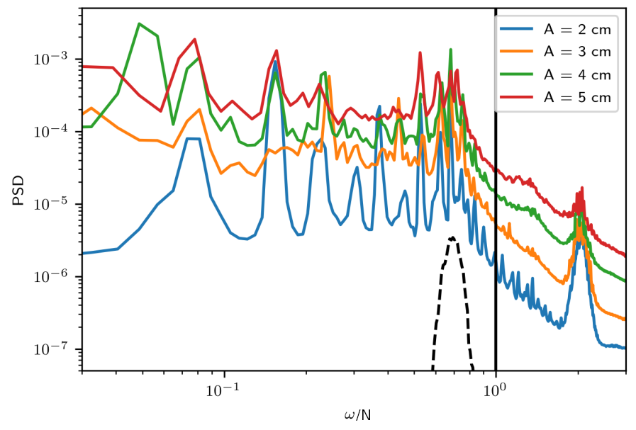 Basically same parameters than for the experiments in the Coriolis platform: size, viscosity, Brunt-Väisälä frequency $N=0.6$ rad/s, forcing frequency $\omega_f = 0.73 N$ and forcing amplitude.