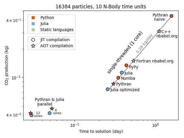 Pour étayer son idée, Zwart présente un benchmark du problème N-Body avec une implémentation inefficace en Python, 50 fois plus lente qu’une implémentation en C++. En tant qu’utilisateurs de Python soucieux de notre impact écologique, nous avons travaillé sur des benchmarks similaires sur le même problème. problème. Contrairement à Zwart, nous (i) considérons des implémentations efficaces en Python et en Julia et (ii) mesurons correctement la consommation d’énergie avec du matériel dédié équipé de wattmètres.