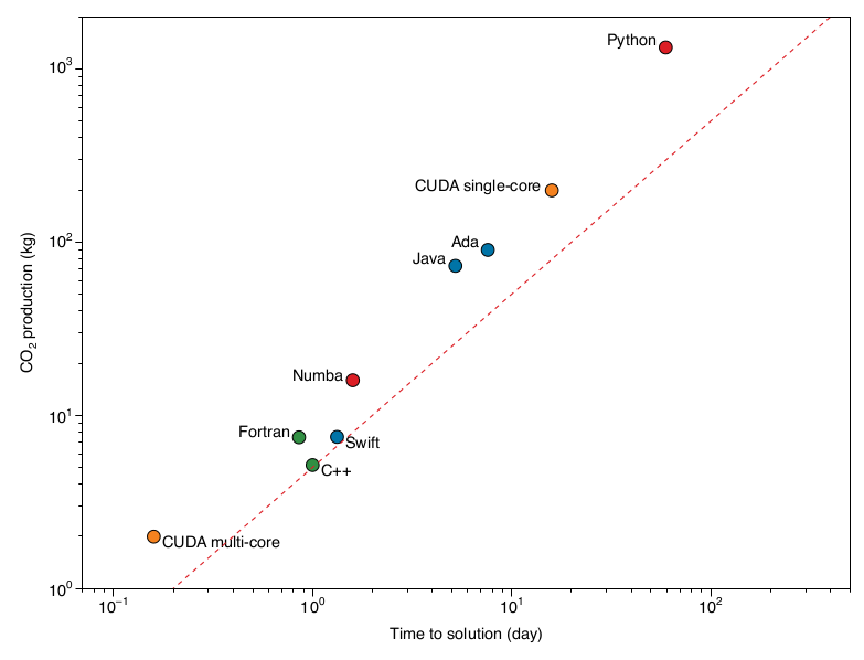 Nous sommes entièrement d’accord avec son message principal : les scientifiques doivent être attentifs à leur empreinte carbone. Par contre, nous avons montré qu’une des solutions proposées, éviter le langage de programmation Python, n’est pas pertinente. Nous montrons qu’elle serait contre-productive et que les programmes scientifiques écrits en Python peuvent être efficaces et économes en énergie. Nous soutenons que l’avancement de la technologie des compilateurs, les facteurs humains et l’éducation sont bien plus importants que le choix du langage.