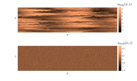Résumé/Abstract : In recent years, a consistent theory of strongly stratified turbulence, mainly based on scaling analysis, has emerged. This theory allows us to predict the vertical length scale of the characteristic layers of stratified turbulence and the energy spectra in the horizontal and vertical direction. In this work, I look at the reasons why vertical energy spectra measured in direct numerical simulations (DNS) are actually in disagreement with the prediction from this theory. To do this, I use a scale decomposition of the vertical spectrum into a large-scale vertical spectrum E_large(k_v) and a small-scale vertical spectrum E_small(k_v), based on a spectral cut-off filter at a certain horizontal wavenumber. A similar method allows the velocity field to be decomposed in a large-scale part u_large(x,y,z) and a small-scale part u_small(x,y,z) (see Figure). The decomposition was applied to DNS of stratified turbulence with forcing and it was found that E_large(k_v) is in very good agreement with the theoretical prediction. The reason for the discrepancy of the full vertical spectrum E(k_v) = E_large(k_v) + E_small(k_v) with this prediction is that the small scales are aliased onto the full spectrum at moderate wavenumbers, which should correspond to large scales. By filtering out the small scales we therefore recover the theoretical form and we find results that are also in good agreement with ocean measurements. This work reconciles theory and numerical simulations of strongly stratified turbulence and may provide a way to interpret observations of ocean turbulence.