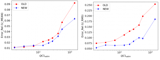 La figure ci-dessous montre la norme L2 de l’erreur sur les champs UMOYEN et URMS. Le nouveau schéma permet une description légèrement meilleure du champ de vitesse moyen, en particulier sur les maillages grossiers (valeurs élevées de QC1adim). L’amélioration est encore plus marquée pour le champ de vitesse URMS, l’erreur étant réduite de 20 % à 50 % avec le nouveau schéma par rapport à l’ancien. Les travaux en cours portent sur l’amélioration de la stabilité et de la robustesse des simulations tout en utilisant des termes d’ordre supérieur dans les développements de Taylor et les intégrations de surface. En effet, le cadre haute-précision actuel est initialement conçu pour l’ordre 3, alors que les développements présentés dans ce rapport restent à l’ordre 2. Cependant, les premiers résultats obtenus avec une version simplifiée de la méthodologie restent très prometteurs, que ce soit en termes de réduction de l’erreur pour une taille de maillage donnée, ou de réduction du coût de calcul pour un niveau d’erreur donné.