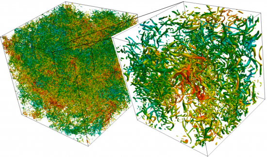 Ce travail vise à comparer les nouvelles prédictions théoriques pour la turbulence 3D homogène isotrope avec les simulations numériques. Dans ce but, des simulations numériques directes (DNS) à haute résolution d’un écoulement turbulent 3D sont réalisée à l’aide du code pseudospectrale SCALES. Les simulations ont été effectuées pour un écoulement turbulent incompressible dans un domaine cubique avec des conditions limites périodiques sous forçage aléatoire, afin de permettre la comparaison avec le modèle théorique de la turbulence homogène isotrope.